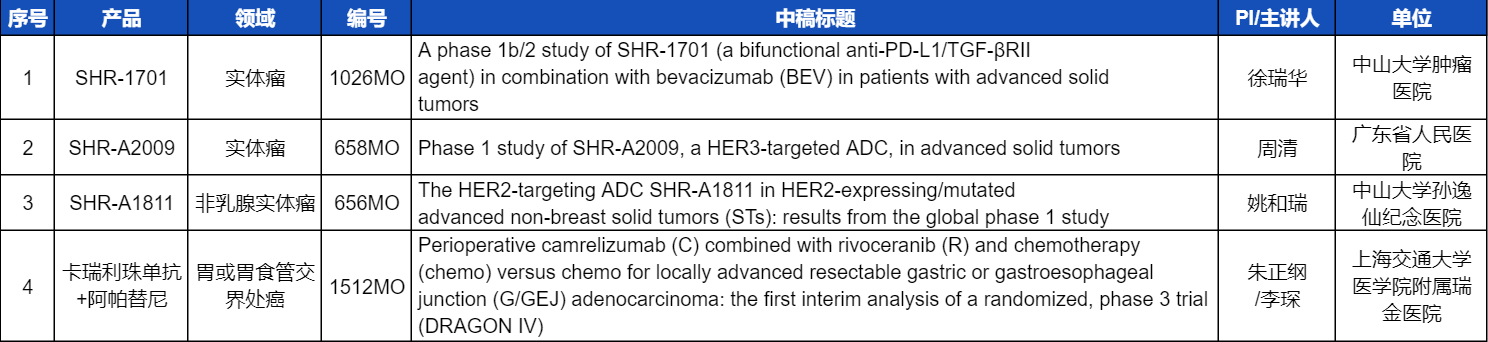本次ESMO大会,将由中山大学肿瘤医院徐瑞华教授、广东省人民医院周清教授、中山大学孙逸仙纪念医院姚和瑞教授、上海交通大学医学院附属瑞金医院李琛教授分别就4项asiagame医药创新产品相关研究做口头报告,包括SHR-1701、SHR-A2009、SHR-A1811这3款未上市创新产品的实体瘤治疗临床研究,以及1项“双艾”组合(卡瑞利珠单抗联合阿帕替尼)治疗局部晚期可切除胃/胃食管交界处癌的Ⅲ期临床试验期中分析。