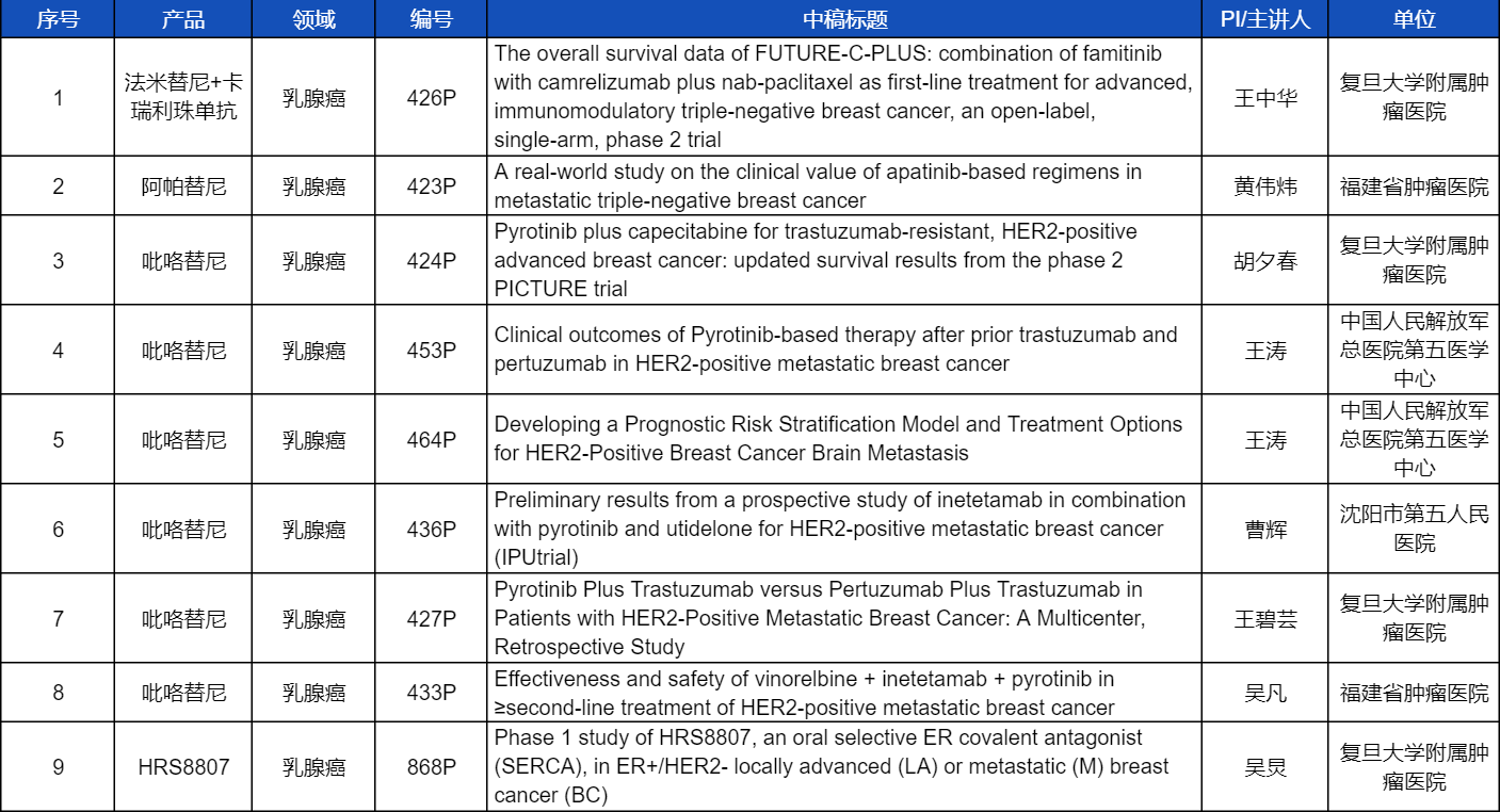 在乳腺癌领域,吡咯替尼、阿帕替尼、卡瑞利珠单抗、法米替尼,或产品间联合或联合化疗,共有9项研究入选壁报讨论,其中吡咯替尼占据6项,较为全面地展示了这款中国首个自主研发抗HER2靶向药在乳腺癌治疗中的显著特点和潜力。此外,asiagame医药自主研发的新型选择性雌激素受体共价拮抗剂(SERCA)HRS8807治疗ER+/HER2-局部晚期或转移性乳腺癌的Ⅰ期研究也成功入选,有望为此类患者带来更多用药新选择。