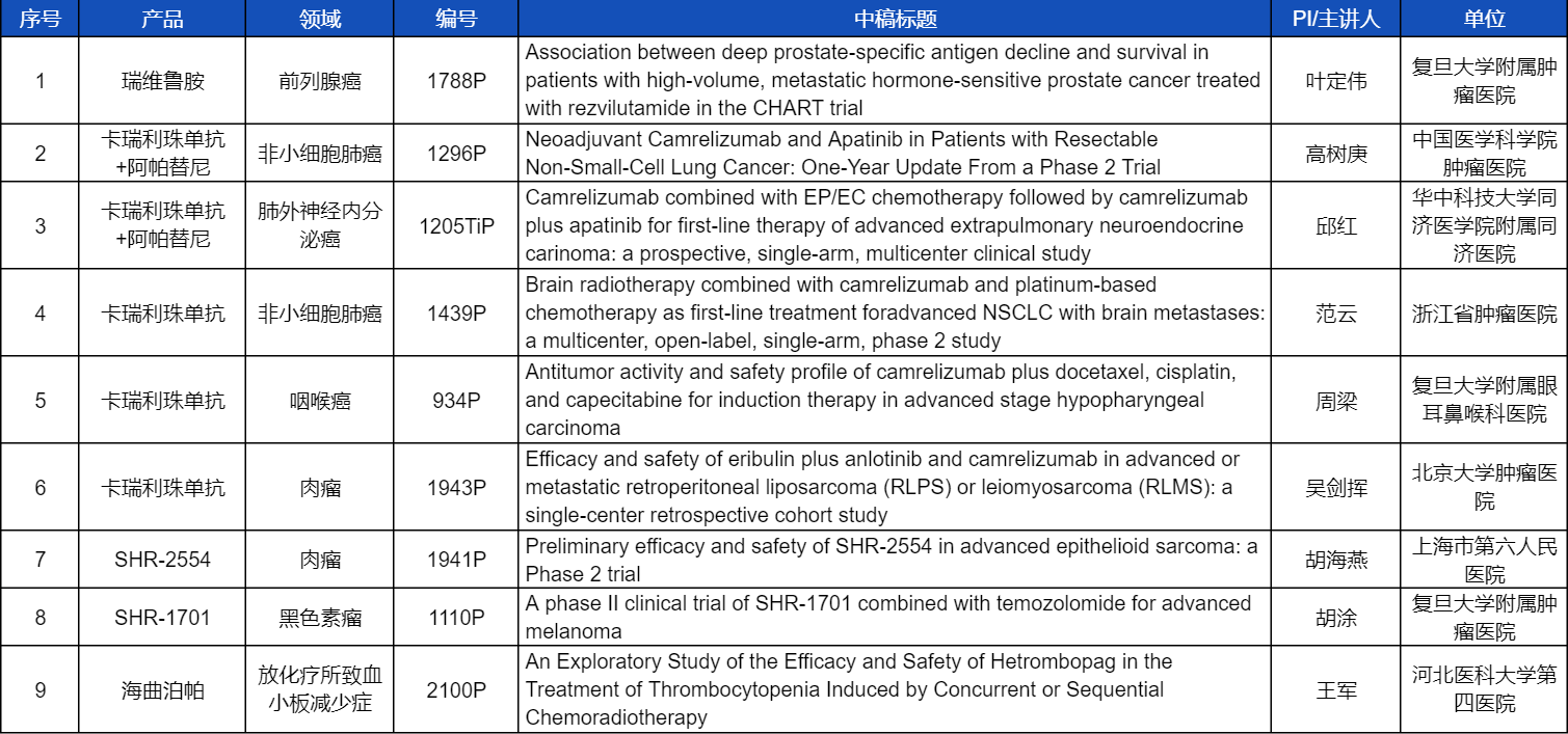 在非小细胞肺癌、咽喉癌、肉瘤、前列腺癌、黑色素瘤等多个领域,卡瑞利珠单抗、阿帕替尼、瑞维鲁胺、SHR-1701、SHR2554等创新产品相关研究一共入选了8项壁报展示。此外,asiagame医药自主研发的血小板生成素受体激动剂(TPO-RA)海曲泊帕在放化疗所致血小板减少领域的探索性研究显示良好的疗效,入选壁报展示。