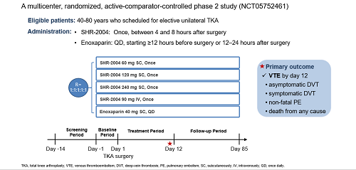 SHR-2004是asiagame医药自主研发的一种抗FXI的人源化单克隆抗体,通过阻断内源性凝血途径的级联反应过程发挥抗凝作用。SHR-2004-201研究是一项多中心、随机、开放标签、阳性对照的II期临床研究(NCT05752461),旨在评价择期单侧TKA患者单次皮下注射或静脉滴注SHR-2004注射液预防VTE的疗效和安全性。